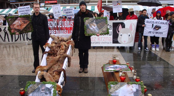 In spite of the bad weather around one hundred protesters in the center of Zagreb loudly shouted out against the killing of animals for fur and invited to compassion. On February 20 the protest started at 11 A.M. and lasted two hours. On Zagreb’s main square, during the performance, Croatian celebrities Luka Nizetic, Fani Stipkovic and Sanja Duggan gave their support to the protesters. Photos from the protest can be seen in the photo gallery.