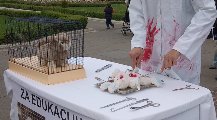 On World Day of Animals in Laboratories, April 24, we represented InterNICHEhumane education with a performance on Zagreb’s King Tomislav Square. InterNICHE offers practical support to teachers to replace animal experiments and encourages students to defend freedom of choice concerning their learning methods. Together with the InterNICHE network, we will promote ethical methods in education throughout Croatia and demand an education that does not include torturing and killing of animals. In accordance with that we will send examples of non-animal educational methods to universities all over Croatia and we invite all interested students and professor for collaboration.