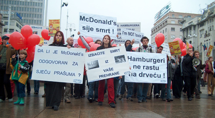 16. listopada 2004., preko 60 aktivista i građana glasno je prosvjedovalo zagrebačkim ulicama na Svjetski dan borbe protiv McDonald’sa, koji se ujedno poklapa sa Svjetskim danom hrane. Povorka prosvjednika s megafonom, zviždaljkama, stotinjak Super Size Me balona i četrdesetak transparenata, bučno je krenula u subotu u podne ispred HNK te se nastavila kretati Frankopanskom, Ilicom, Trgom bana Jelačića do svojeg odredišta u Jurišićevoj ulici, prvog McDonald’sovog restorana u Hrvatskoj.