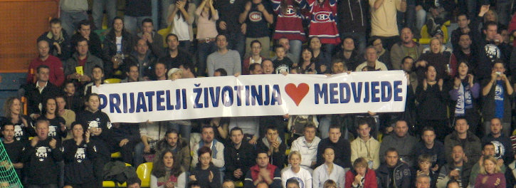 Petnaest aktivista i simpatizera Prijatelji životinja na utakmici zagrebačkog Kluba hokeja na ledu Medveščak protiv austrijskog kluba KAC Klagenfurt 30. listopada u Ledenoj dvorani Doma sportova razvilo je veliki transparent ‘PRIJATELJI ŽIVOTINJA VOLE MEDVJEDE’. Ovime smo, kao i na utakmicama Medveščaka protiv Red Bull Salzburga (17.11.) i Vienna Capitals (20.11.), dali potporu trenutačno najpopularnijem sportskom klubu u Zagrebu te još jednom ukazali na iskorištavanje, mučenje i ubijanje životinja zbog ‘modnih trendova’! Odgovor Medvjeda na ovaj ‘izazov’ uskoro se očekuje!