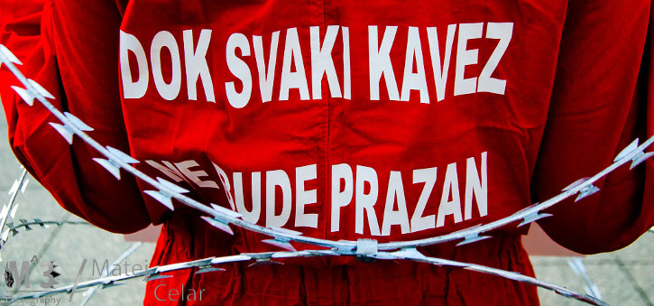 Međunarodni Dan prava životinja obilježili smo performansom na glavnom zagrebačkom trgu. Aktivisti okovani lancima izložili su kolut žilet-žice ukazujući na ranjavanja i smrt životinja. Osim na granici, životinje pate i unutar mnogih zidova, ograda i kaveza. Poziv protiv žilet-žice ujedno je poziv na odbacivanje bilo kakve okrutnosti prema živim bićima.X
