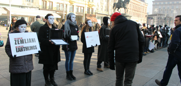 Pozvali smo sve da povodom Međunarodnog dana prava životinja ne zatvaraju oči pred nasiljem nad životinjama i da pogledaju film Zemljani. U subotu, 10. 12., izveden je performans ”Iskustvo Zemljana” na zagrebačkome Trgu bana Jelačića. Svi koji su sudjelovali u performansu nosili su crnu odjeću i bijele maske na licima te transparentima i prikazom filma pozivali na veganstvo. Pogledajte fotografije s akcije i savjetujte svima da pogledaju film ”Zemljani”.