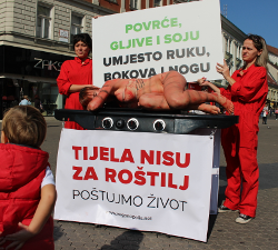 Svjetski dan vegetarijanstva obilježava se 1. listopada još od 1977. godine, s ciljem poticanja ljudi da razmisle o etičkim, ekološkim i zdravstvenim prednostima vegetarijanskog načina života. Naša aktivistica simbolički je pretvorila svoje tijelo u komad mesa na roštilju. Performansom se željelo prikazati da ničije tijelo nije za roštilj te da umjesto ruku, bokova i nogu možemo jesti obilje ukusnih biljnih namirnica koje su dobre za naše zdravlje i okoliš.x
